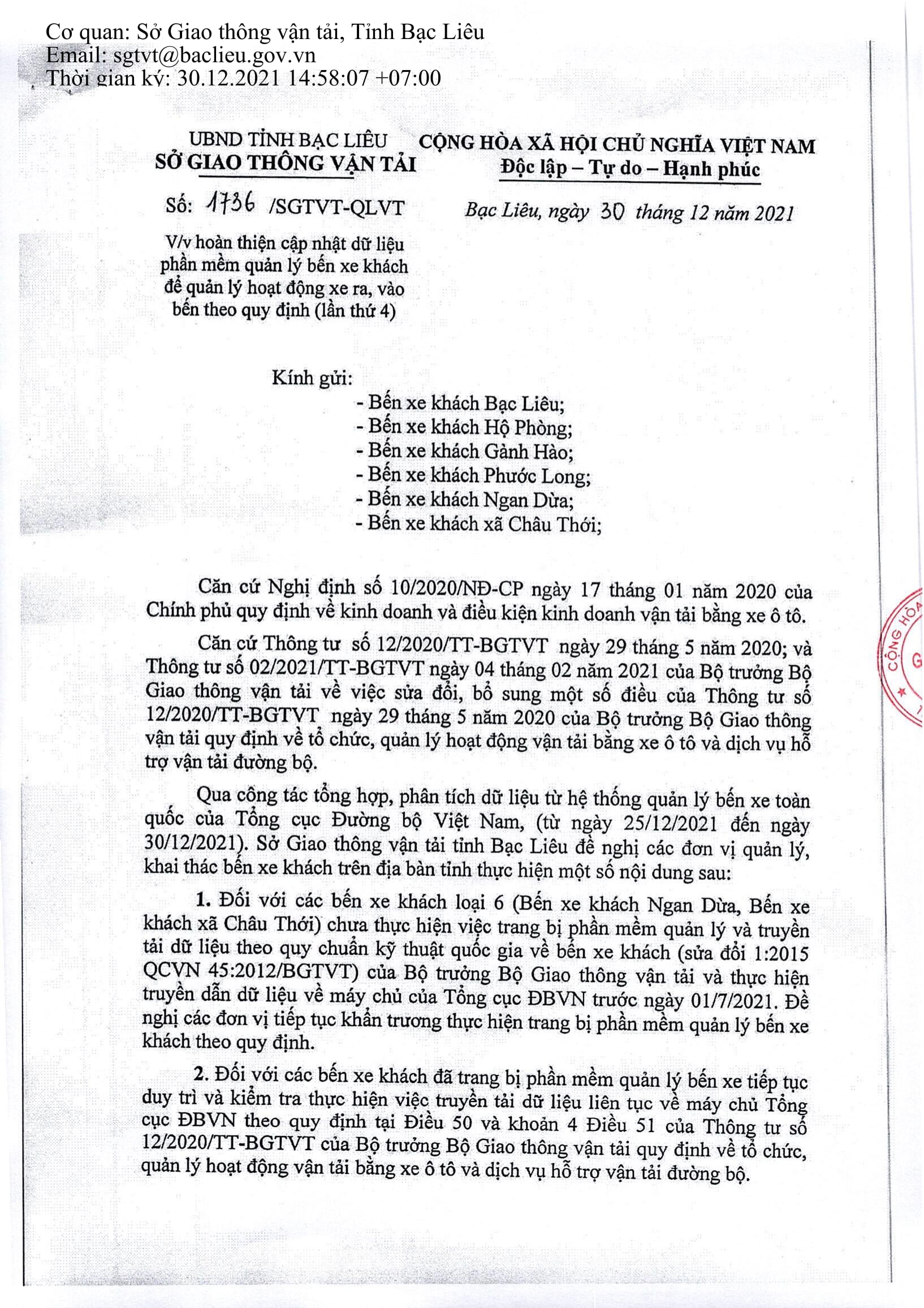 - Công văn v/v báo cáo tiến độ áp dụng phần mềm quản lý bến xe khách theo lộ trình quy định tại Nghị định số 10/2020/NĐ-CP ngày 17/01/2020 của Chính Phủ (30/06/2021)